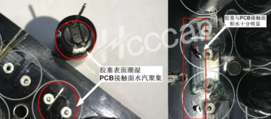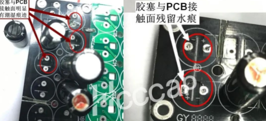 特征表现:PCB腐蚀区域有水油状液态残留物,而非白色或黄(棕)色电解质结晶,同时,电容胶塞底部液态残留物堆积较多;