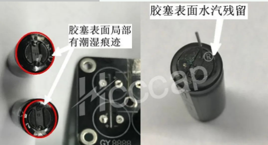 2. 凝露在电容胶塞底部堆积形成液态水,该水分未能在短时间内挥发 ,与泄漏出的微量电解液结合形成电解池。【电解池】【微量】